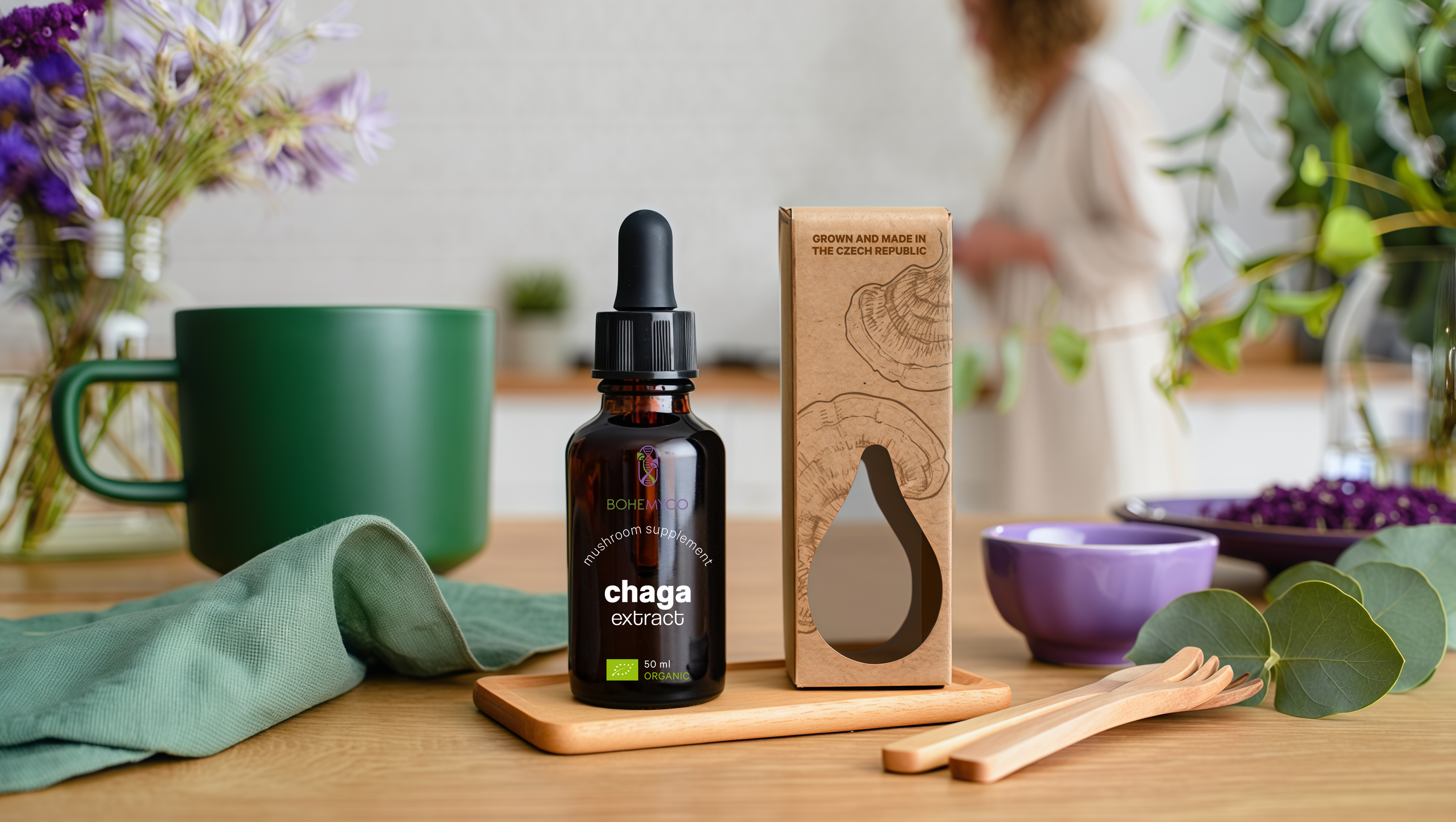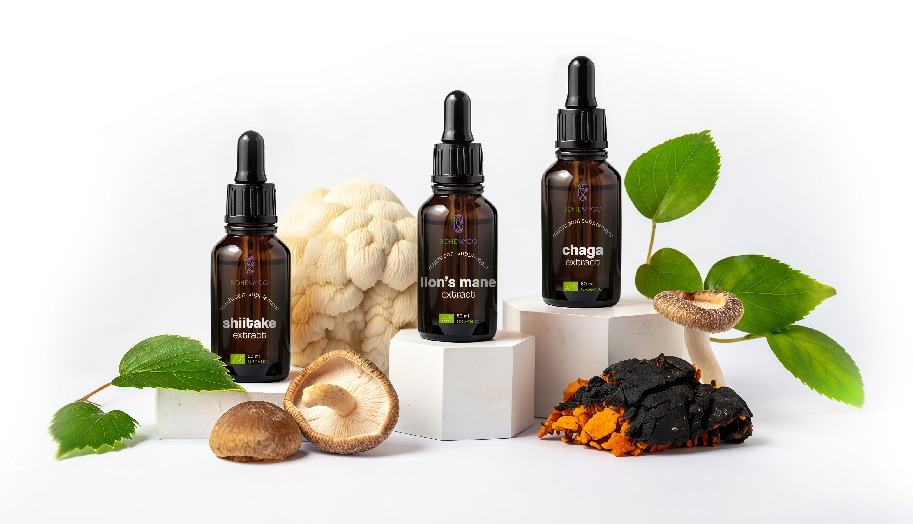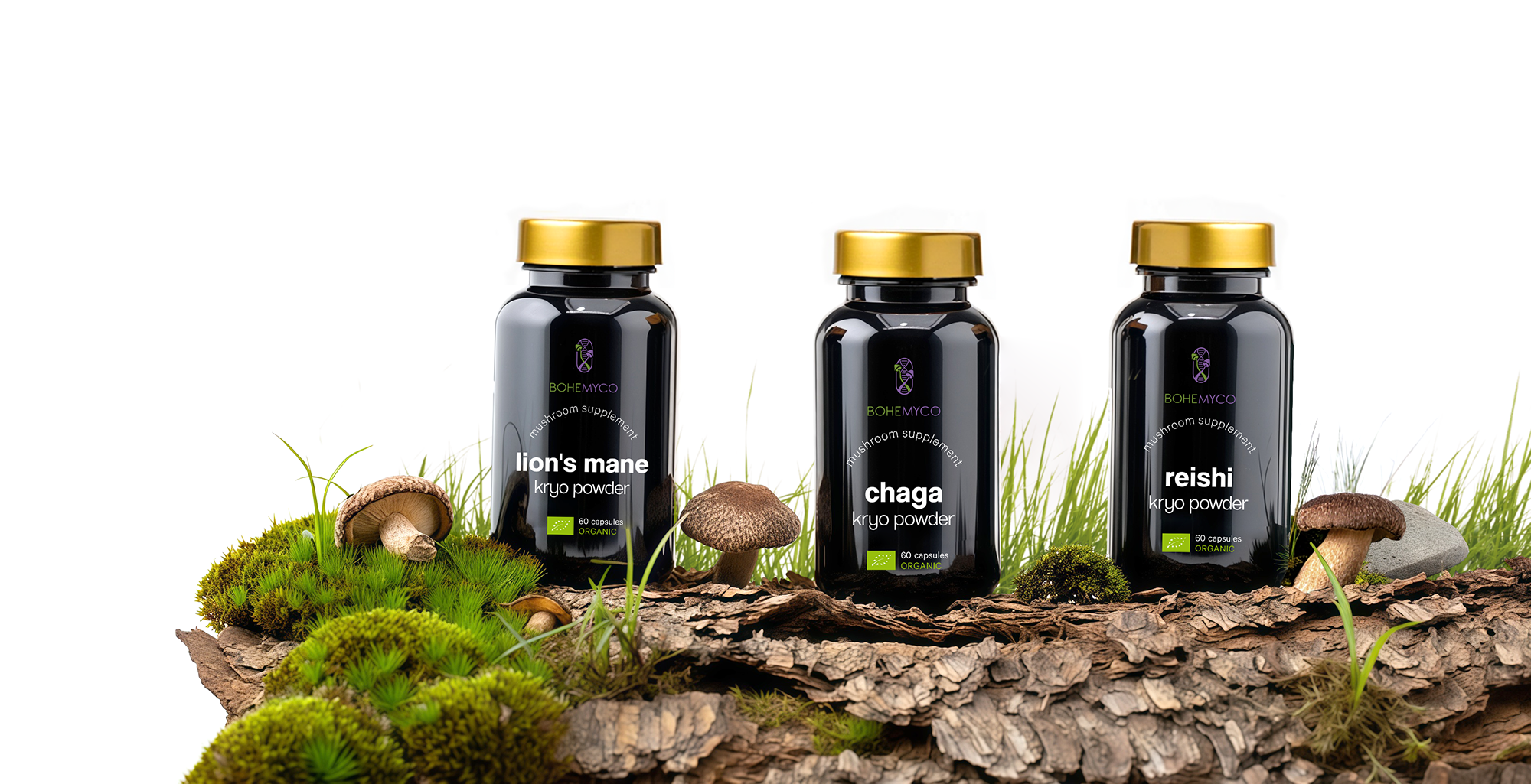 All products are made from mushrooms of the highest quality, cultivated in the pristine environment of Czech Bohemia, where every stage of their development is carefully controlled. The Chaga comes from wild Finnish forests, renowned for their crystal-clear nature and rich bioactivity.